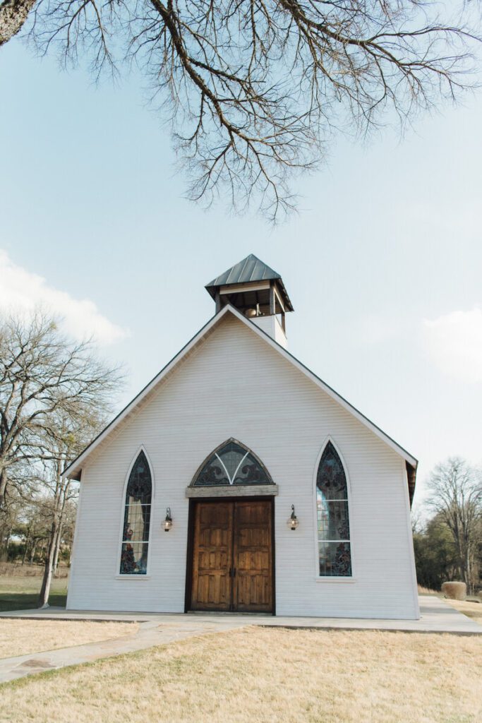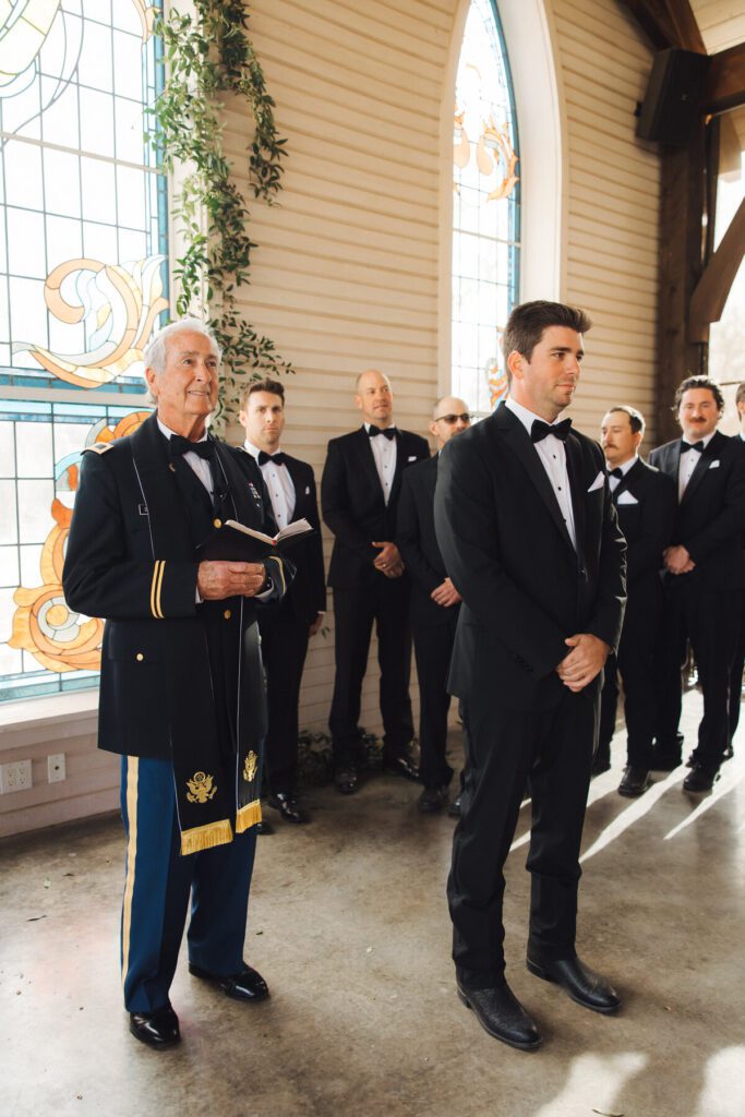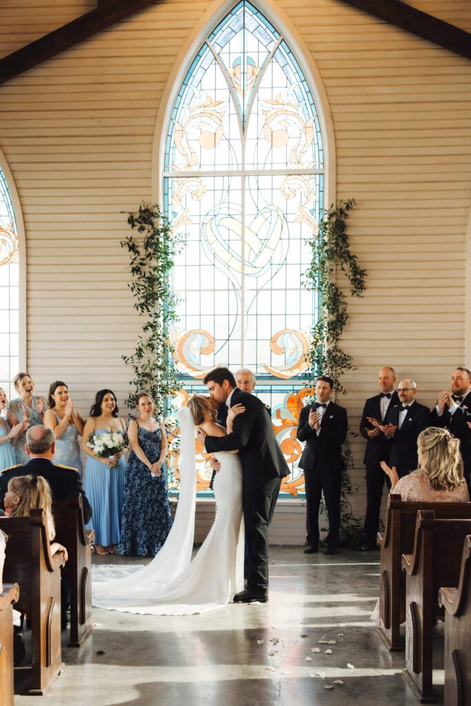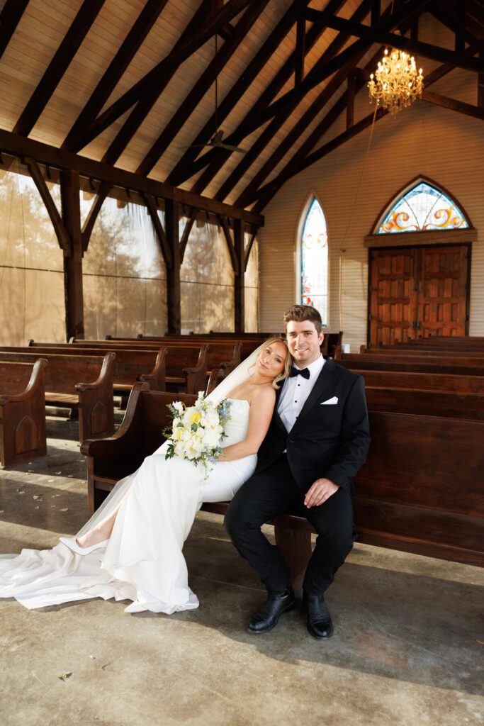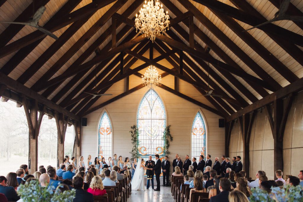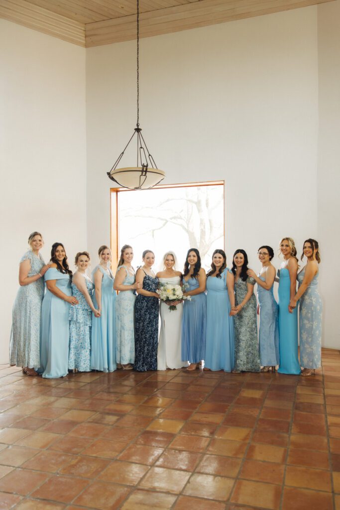 Their ceremony took place in the open-air chapel at La Bonne Vie Ranch, which offered beautiful rustic charm while allowing fresh air to flow through its open sides. Bridesmaids wore flowing blue maxi dresses in varying patterns, perfectly capturing the relaxed spring elegance of the day, while the groomsmen balanced the look in classic black tuxes.